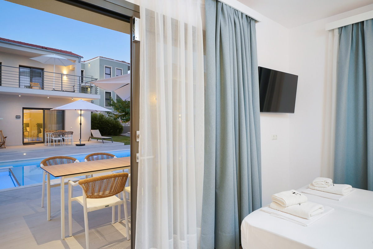 It can comfortably accommodate up to four people. Relax reading a book or sipping a glass of wine by the pool and rejuvenate your senses. Family Studio provides everything a guest may need such as a king size bed, twin beds, fully equipped kitchenette, microwave, small fridge, coffee maker, flat TV, free internet access, safe, wardrobe, air conditioning, spacious bathroom with shower and unlimited view of nature and pool.